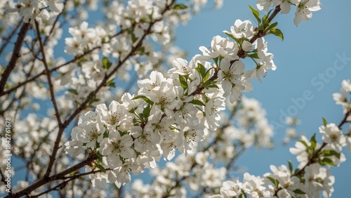 © Lasvu, Obraz premium Cherry blossom branch with white flowers against a blue sky.