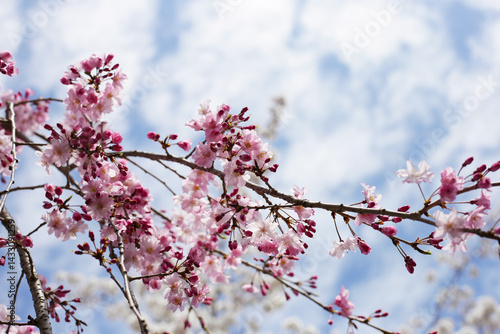 © Bowonpat, Fototapeta premium Cherry blossom branches against blue sky
