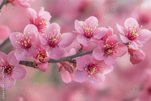 Obraz premium Cherry blossom branches bloom in vibrant pink during springtime in a serene...