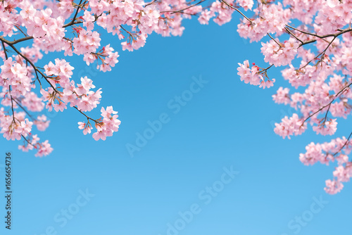 Fototapeta premium Cherry blossom branches with vibrant pink flowers against a bright clear blue...