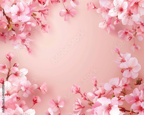 © Serhii, Fototapeta premium Cherry Blossom Card. Pink and White Flower Frame for Wedding Invitation and Greeting Cards