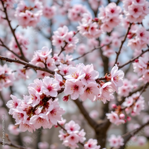 Fototapeta premium Cherry Blossom Flowers Blooming on a Tree in Spring with Soft Pink Petals and...