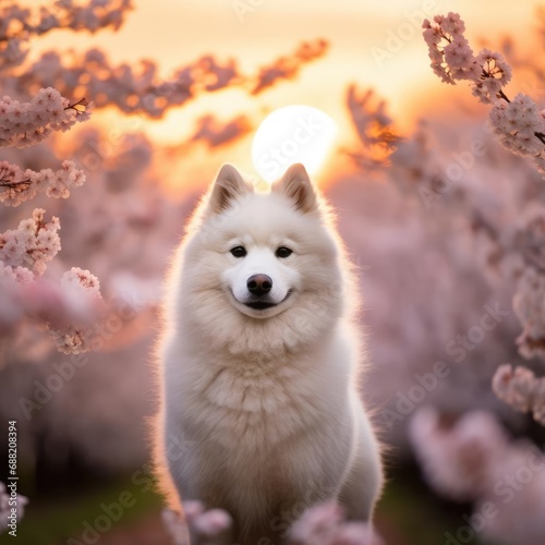 Obraz premium Cherry Blossom Frolic: A Japanese Spitz at Sunset