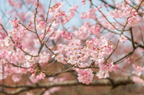 Fototapeta premium Cherry blossom in april, sakura branch over blue sky background, South Korea,...