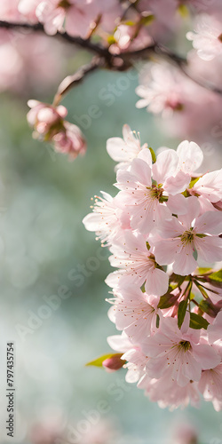 Fototapeta premium Cherry blossom in full bloom against stark minimalist landscape. Soft spring...