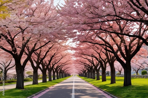 © Michael, Obraz premium Cherry Blossom Lane Surrounded by Lush Trees and Soft Petals in a Stunning Spring Scene