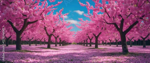 © The 2R Artificiality, Obraz premium Cherry Blossom Orchard in Full Bloom with Vibrant Pink Petals Under Clear Blue Sky Perfect for Springtime Nature and Landscape Photography