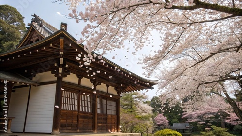 Fototapeta premium Cherry blossom petals gently falling from the branches of a Shinto shrine's surrounding trees onto its wooden roof and tiled walls, nature, wooden structures, flowers