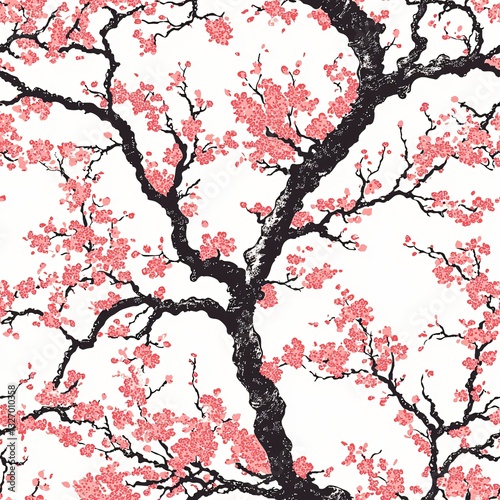 Fototapeta premium Cherry Blossom Seamless Pattern: A Whimsical Floral Design with Delicate Pink Blossoms and Dark Branches.