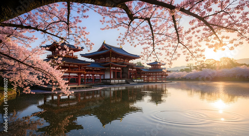 © Sajida, Fototapeta premium Cherry Blossom Temple Reflections: Tranquil Japanese Garden by the Water