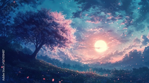 Naklejka premium Cherry Blossom Tree at Sunset with Petals Floating in the Breeze