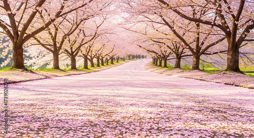 © boonpeng, Fototapeta premium Cherry Blossom Tree Full Bloom with Pathway of Petals
