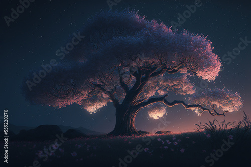 Obraz premium cherry blossom tree, night sky, spring, bloom, landscape, art illustration