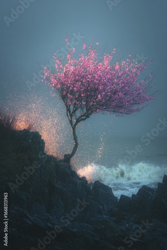 © LEXI Studio, Fototapeta premium Cherry blossom tree on a cliff by the ocean with crashing waves.