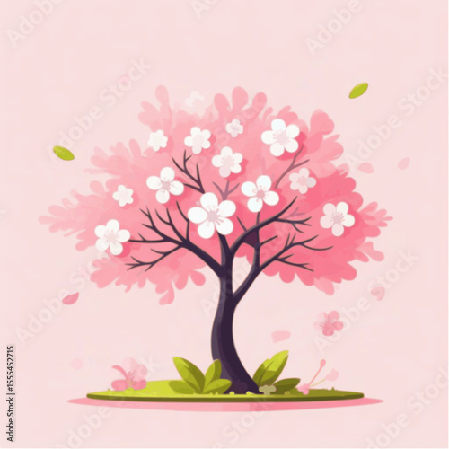 © Sahroni, Fototapeta premium Cherry blossom trees are in bloom with petals flying in the air.