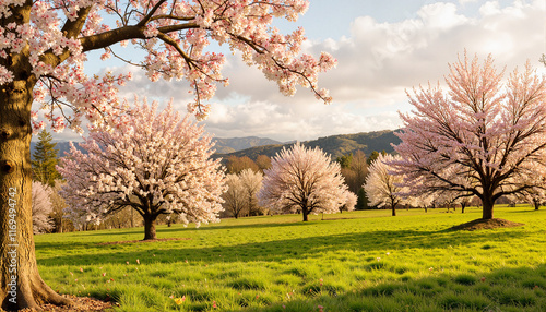 Fototapeta premium Cherry blossom trees blooming in spring meadow