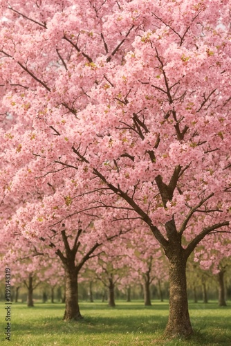 Naklejka premium Cherry Blossom Trees Create a Beautiful Pink Pathway in Springtime Park Setting