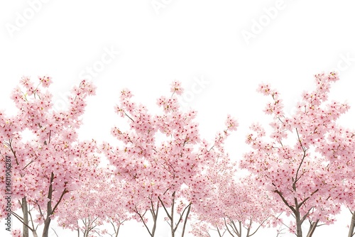 Fototapeta premium Cherry blossom trees in full bloom against white background, spring season floral display