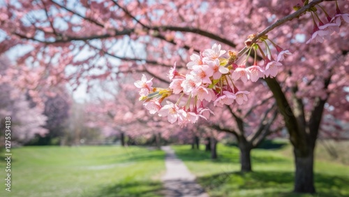 Naklejka premium Cherry blossom trees in full bloom with soft pink flowers framing a serene...