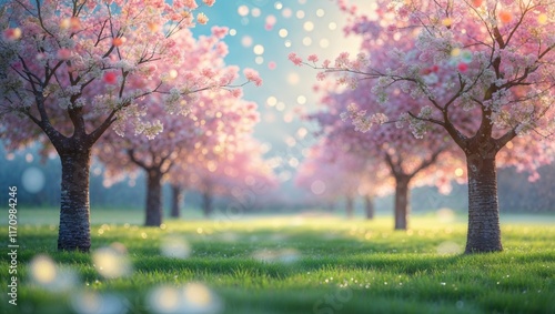 © demzp, Fototapeta premium Cherry blossom trees line a serene park pathway during a sunny spring afternoon