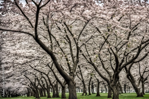 © Rabia, Obraz premium Cherry blossom trees losing their petals while green leaves start to sprout, Ai Generated