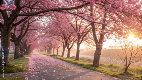© Alend, Fototapeta premium Cherry Blossom Tunnel A Serene Pathway Under Pink Blooms, Sunlight and Petals