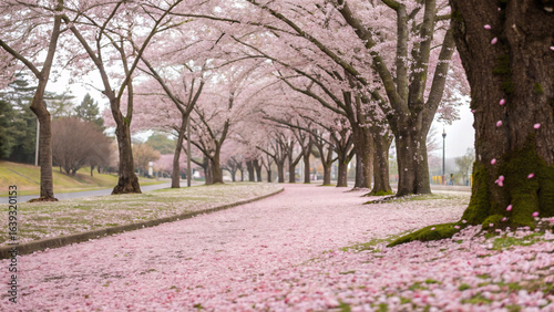 © Wachiraya, Fototapeta premium Cherry blossom tunnel pathway covered in pink fallen petals with blooming sakura trees creating natural archway in spring park