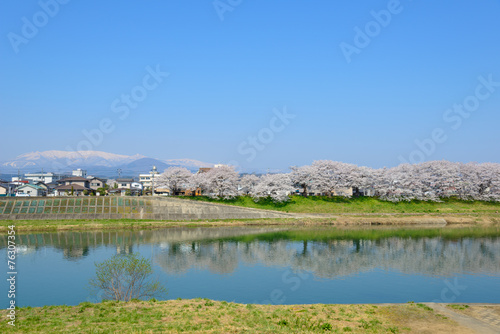 © Hirotaka Ihara, Obraz premium Cherry blossoms along Shiroishi river (Shiroishigawa tsutsumi Se
