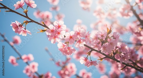 Obraz premium Cherry blossoms bask in sunlight branches reaching up to a brilliant blue sky