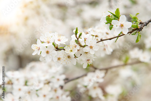 Obraz premium Cherry blossoms, beautiful white flowers in spring sunny day for background...