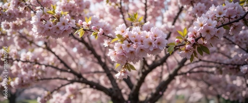 Fototapeta premium Cherry blossoms in full bloom on tree branches outdoors.