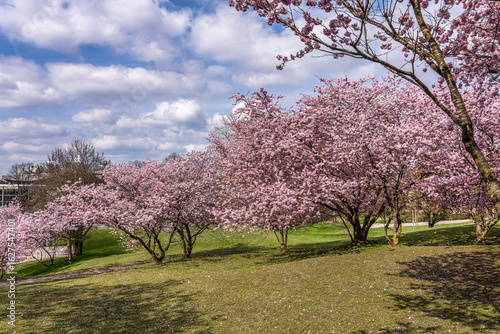 Obraz premium Cherry blossoms in Munich, Germany. Pink cherry blossoms with a blue and cloudy sky background. Spring in Germany.