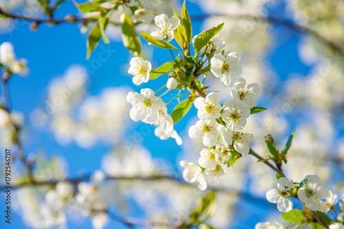 © yanadjan, Fototapeta premium Cherry blossoms in the garden in spring. Selective focus.