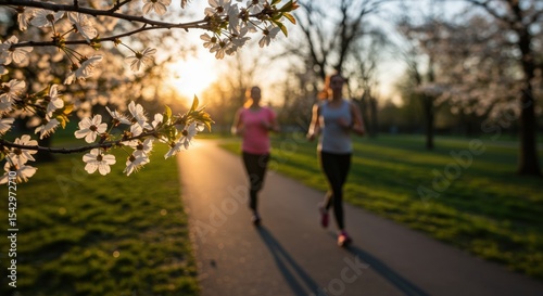 © NN AI, Fototapeta premium Cherry blossoms joggers running park sunset golden light exercise. Spring fitness outdoor activity healthy lifestyle recreation. Wellness concept