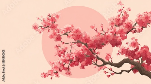 © Satria, Fototapeta premium Cherry blossoms with circular pink backdrop, branches in lower-right corner