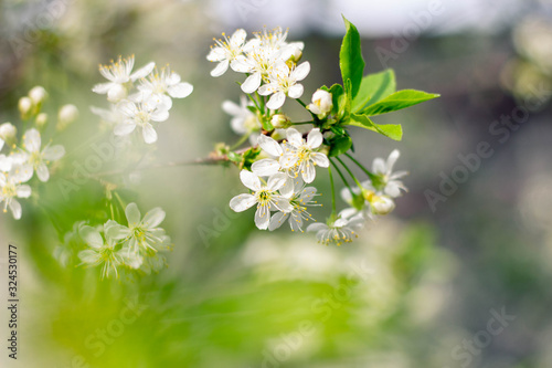 Fototapeta premium Cherry branches are covered with white flowers and green leaves. Background with flowers on a spring day.