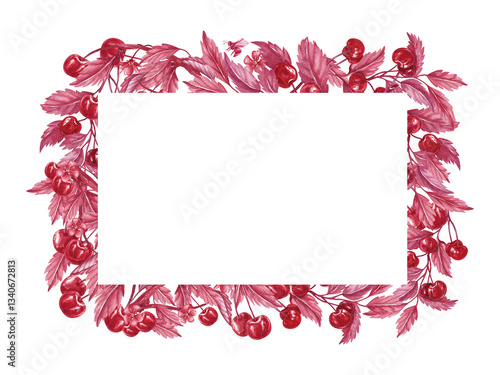 © Yulia Kapura, Obraz premium Cherry branches rectangular frame with template inside. Watercolor illustration isolated from the background. Red monochrome style. Perfect for packaging tincture, liqueur, compote, dumplings, logo