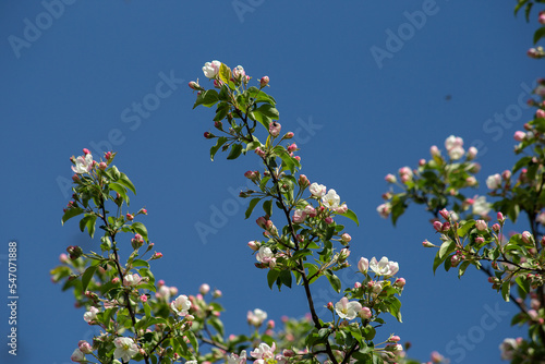 © Olga, Obraz premium Cherry branches with white flowers and green leaves on a blue sky background.