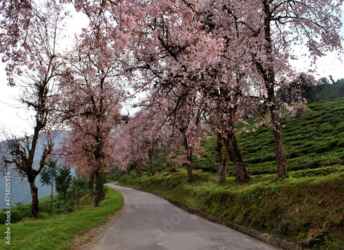 © Bishal, Fototapeta premium Cherry fully blossom at Temi Tarku in South Sikkim, looks mesmerizing. Cherry is sign of cold, so it brings winter here in the state.
