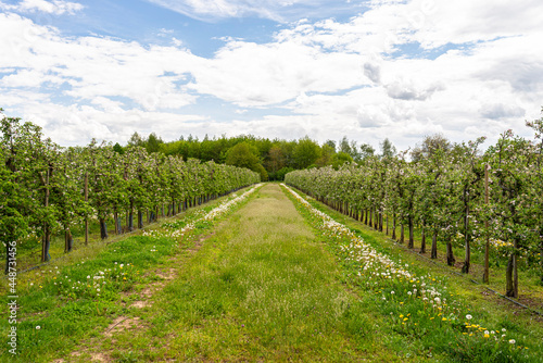 © Michal, Obraz premium Cherry orchard with pink flowers on trees, dandelion flower visible.