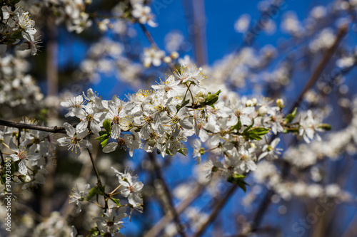 © lizaveta25, Obraz premium Cherry plum branch strewn with white flowers against a blue sky.
