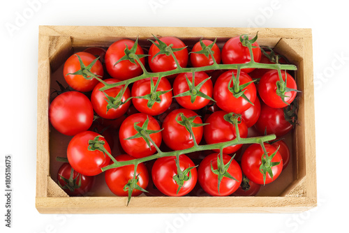 Obraz premium Cherry tomato bunch in a wooden box isolated on white background. Top view. Flat lay