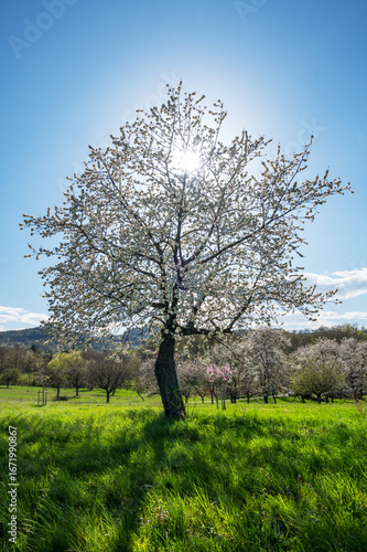 © Ewald Fröch, Obraz premium Cherry tree and blue sky with clouds
