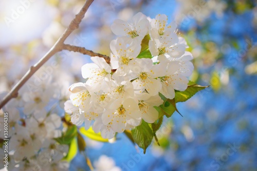 Fototapeta premium Cherry tree blooming in the springtime, blue sky and sunlight