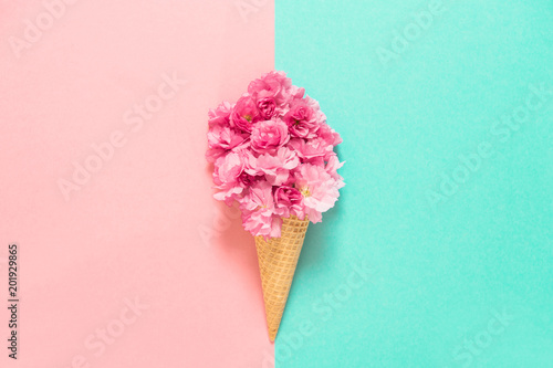 Fototapeta premium Cherry tree blossom in ice cream waffle cone Pink flowers