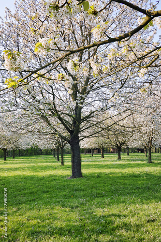 © barmalini, Fototapeta premium Cherry tree blossom, spring season in fruit orchards in Haspengouw agricultural region in Belgium, landscape