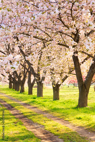 © mutai, Naklejka premium cherry tree in bloom and alley in the park