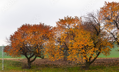Fototapeta premium Cherry tree with reddening leaves. Autumn, fall landscape with a tree full of...