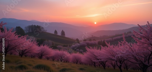 Fototapeta premium Cherry trees at sunrise over rolling hills