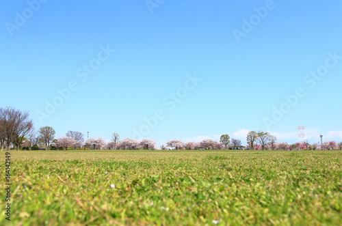 © takadahirohito, Obraz premium Cherry trees in spring landscape